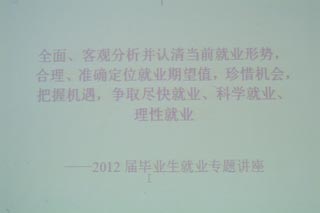 2012年3月20日下午,學院在交通樓J311教室舉辦《全面、客觀分析并認清當前就業(yè)形勢,合理、準確定位就業(yè)期望值,珍惜機會,把握機遇,爭取盡快就業(yè)、科學就業(yè)、理性就業(yè)》的專題講座。學院各系學工辦主任(團總支書記),2012屆畢業(yè)班全體班主任以及2012屆未就業(yè)畢業(yè)生共300余人聽取了講座。