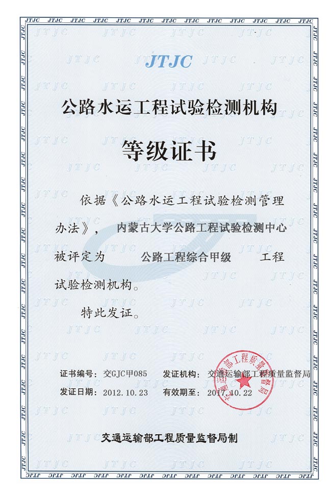 10月23日,交通運輸部工程質(zhì)量監(jiān)督局正式向內(nèi)蒙古大學公路工程試驗檢測中心頒發(fā)了“公路工程綜合甲級”資質(zhì)證書。內(nèi)蒙古大學公路工程檢測中心成為自治區(qū)第一家公路工程綜合甲級檢測機構(gòu),從而填補了自治區(qū)交通行業(yè)綜合甲級檢測機構(gòu)的空白。試驗檢測中心獲得綜合甲級資質(zhì),是內(nèi)蒙古大學交通學院實驗室建設(shè)的一項標志性成果,將為學院教學、科研、技術(shù)服務(wù)提供良好平臺,為密切與交通行業(yè)企業(yè)的合作創(chuàng)造便利條件,也為學院師生創(chuàng)新發(fā)展提供難得機遇。