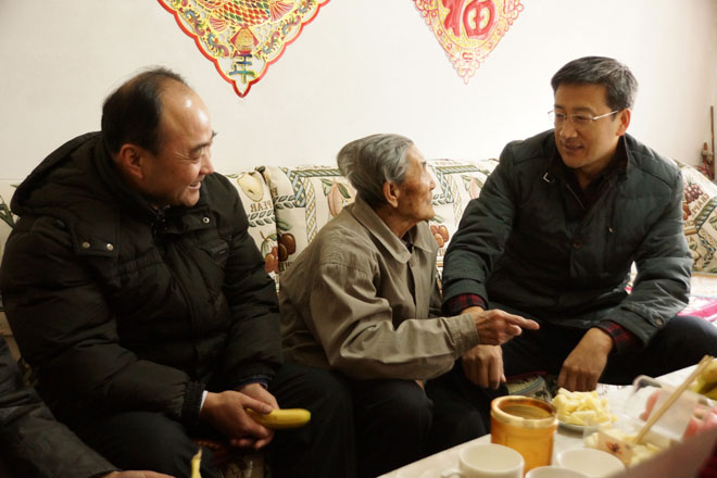 學(xué)院黨委書記孫智憑(右一),副院長武鈞(右三)慰問離休干部拉巴哈(右二)同志 |