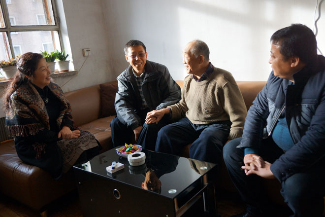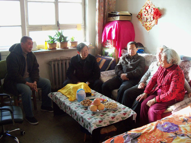學(xué)院院長柴金義(左二),黨委副書記、紀(jì)委書記白托婭(左一)慰問離休干部李成柏(左三)同志 |